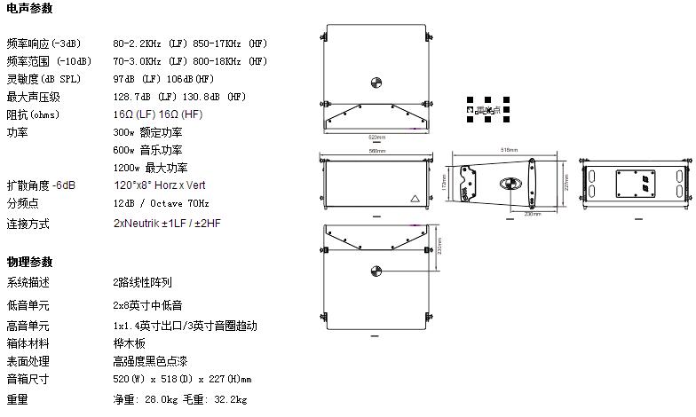 120° 水平擴(kuò)散角度 0° - 8°間隔 1°設(shè)置垂直擴(kuò)散角度 全頻模式 可用于吊掛和落地使用的吊掛系統(tǒng) 系統(tǒng)可配合FL-400SW、SW2000、SW2000H使用 外置DSP處理器進(jìn)行調(diào)試 四點(diǎn)吊掛方式